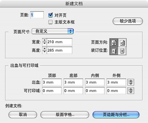 2)在出现的对话框中进行设定:先决定基本页数。选中“主版文本框”以便于以后的文本框的统一。决定页面尺寸,装订方向。再决定出血数值。必要时可选定“可打印区域”数值。完成时选“页边距与分栏”。