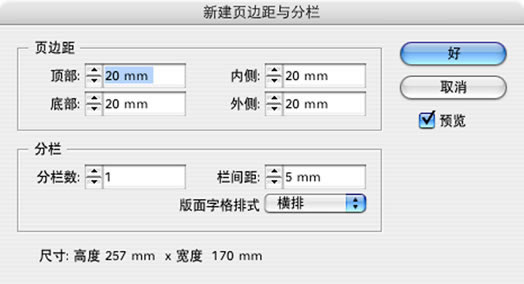 3)在随后出现的对话框中选择版心尺寸、分栏数、文本排式和栏间距等。选“好”。
