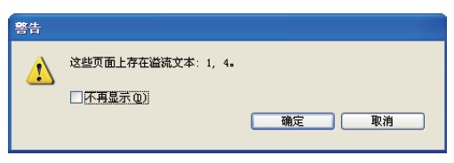 【indesign cs2 、indesign cs3 版本】文件\ 导出,设置保存类型为【pdf】,若文档中有溢流文本,软件会在导出前自动弹出提示信息。