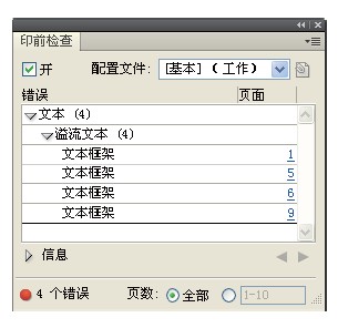 【indesign cs4】窗口\ 输出\ 印前检查,若文档中有溢流文本,则会详细列出。