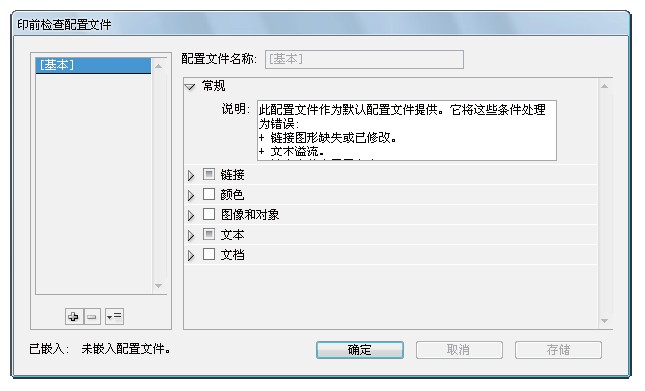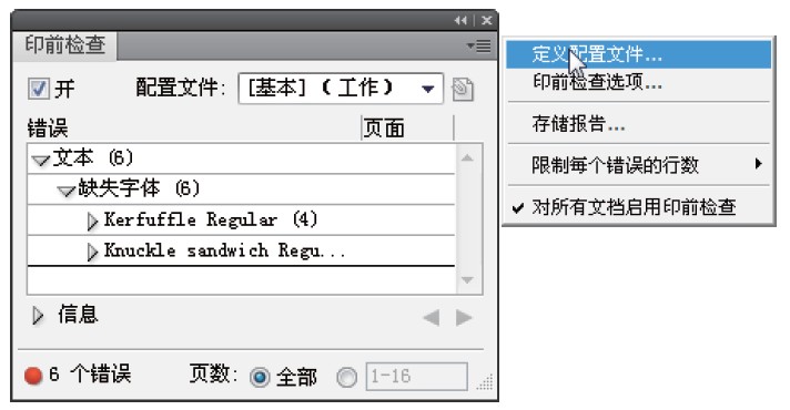 窗口\ 输出\ 印前检查,即可打开印前检查调板,单击右上角的向下三角形,选择定义配置文件。在弹出的对话框中可以对印前检查的内容进行设置。