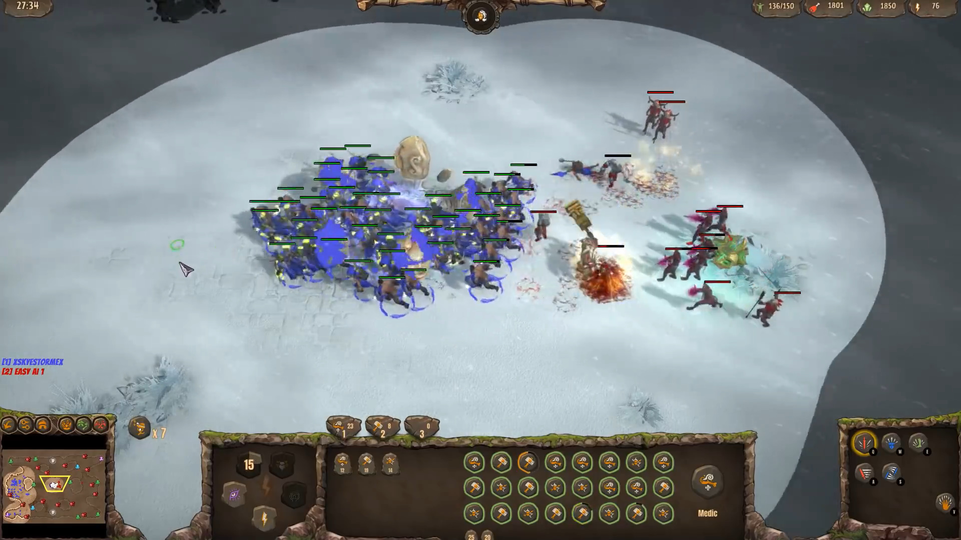 除了以上特殊内容,再聊一聊本作的卖点:英雄和恐龙。游戏中目前只有两大派别,土著和死灵法师,两者在建筑和魔法上也是大相径庭,不过平衡性上却因为这些而引发了一些争议。英雄虽然听着很牛逼,给人有种魔兽中英雄的感觉,然而实际上设定却很鸡肋,英雄可以通过三次科技的升级来学习三次技能,然而这些技能并不像魔兽中英雄的个人技能,而是一些己方全体BUFF能力,那么英雄有什么优势呐?我的回答或许就只能是“血多”了。再说说游戏宣传中说的捕获和驯养恐龙系统,地图中确实有恐龙,也只有土著可以建造恐龙骑手,但是打死后只能获得食物,而真正的恐龙坐骑只需要食物和水晶就能建造,嗯?好像跟说好的不一样,哈?纵观这两大卖点,可能只是制作组发布的两大噱头而已,但是并不会影响游戏的整体体验,或许这也只是制作组的预期,希望能在后续的更新和正式版中加入自己所承诺的事情吧。