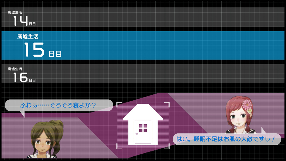 休息一晚让角色体力完全回复的设施“寝室”。成员们基本上都是一人一间房,但如果刻意让两个人在同一个房间里休息,就会产生“陪睡效果”,让两位角色取得各式各样的助益。陪睡效果将根据角色配对有所不同,基本上是仅有进行陪睡的两人才会取得效果,但其中也存在着能涵盖至整个队伍的效果。