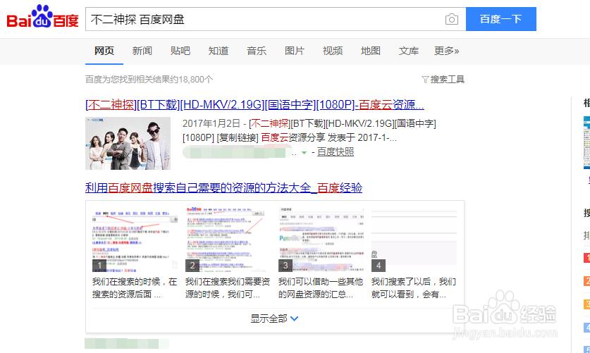 我们在搜索的时候,在搜索的资源后面 都加上一个百度网盘这几个字。效果还是不错的。比如说以不二神探为例。搜索