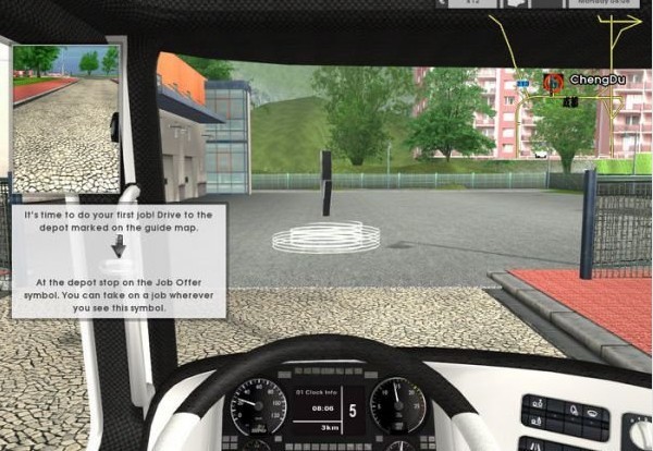 连接上后按N 显示一个大地图找到广州然后你在选择一条合适的路线去广州 你们可以看见在地图上显示了一个红色的圈 把货拉到哪个红色的圈然后按要求把车的挂准确的退到红色的线内 如果可以了会弹出个图提示 然后就可以按 T 键这样就完成了货物的运输。