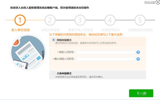 软件安装完成后,首先需要进行系统初始化注册。初始化注册的过程,即是通过税号从税局网络上获取最新的企业信息,保存到本地客户端的过程。