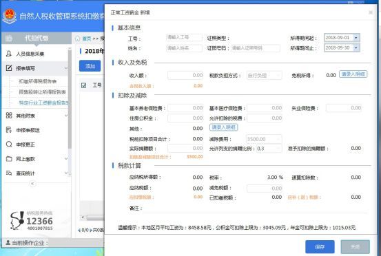 选择“人员信息采集”,添加人员信息成功后填写报表,选择“扣缴所得税报告表”进入“正常工资薪金”,直接点击“添加”按钮录入明细,收入选择“0”填写即可。