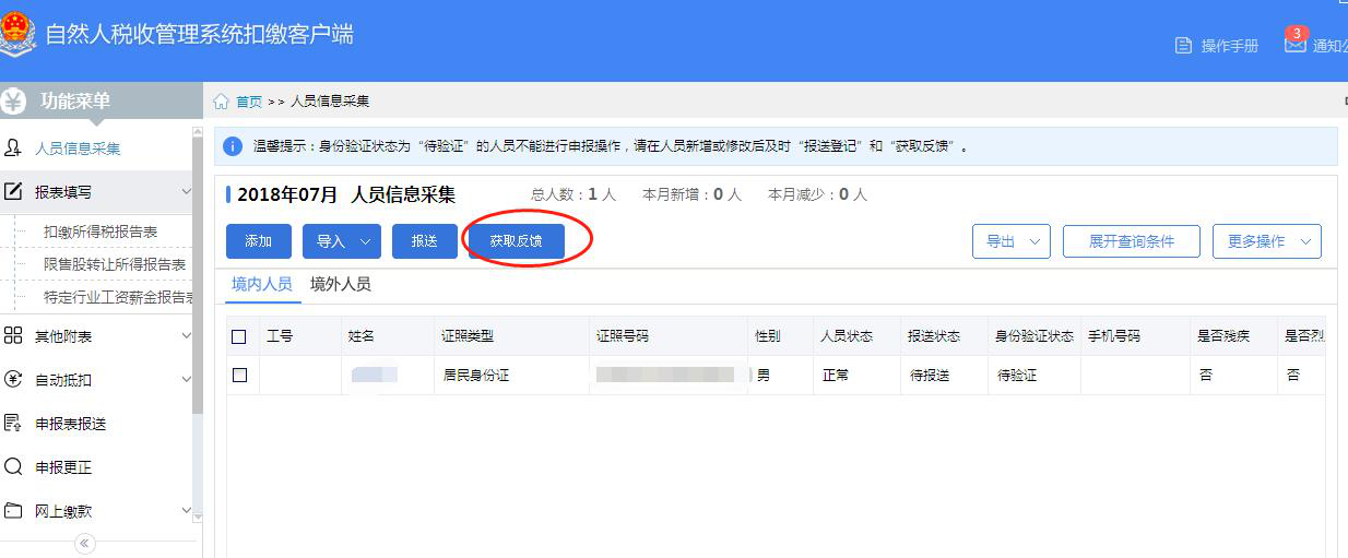 特别注意:新的个税扣缴系统和公安系统联网,新增自然人身份信息比对验证功能,申报之前需先报送人员信息和获取人员信息反馈,否则将无法申报个税,这是新流程区别于旧流程之处。如下图所示: