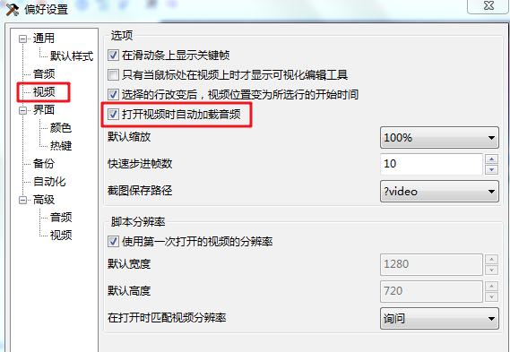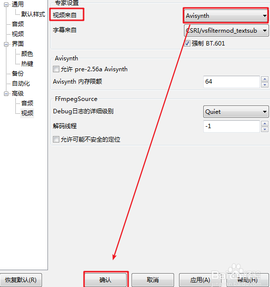 打开偏好设置,找到高级,视屏来自,默认是选择FFmpegSource来解码的,相当于软解,我们选择第二个Avisynth,这时候会弹出一个英文提示,点击确定,这样播放视屏就不会卡,但也有一些其它的问题