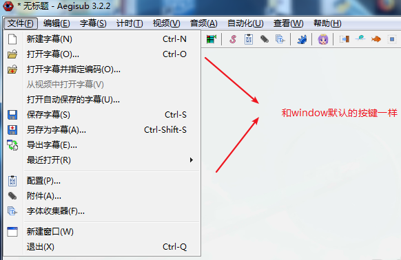 在文件选项那里,我们一般不用新建字幕,直接在下面弄好保存就行了,视屏导入的话也没什么好解释的,音频也是,好多的快捷键在偏设置那里都有,安装好后的aegisub直接使用默认设置就行了