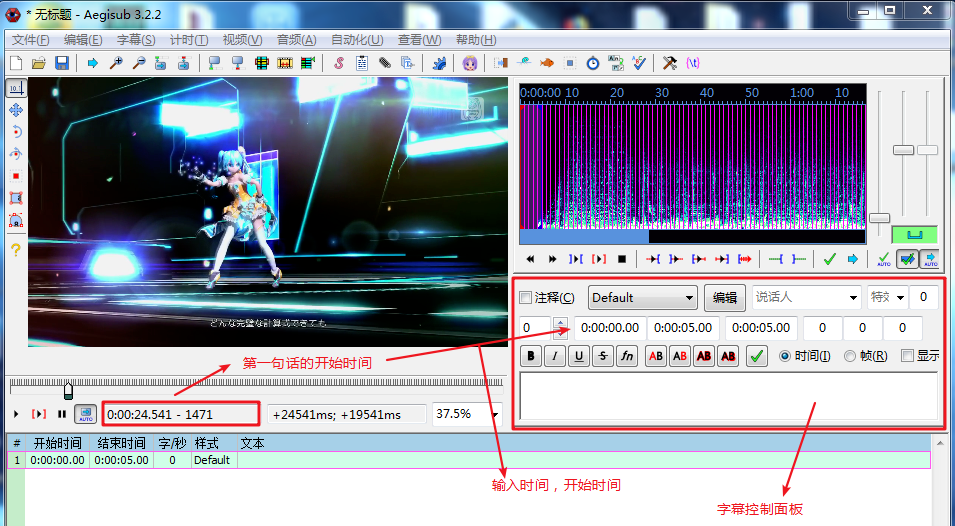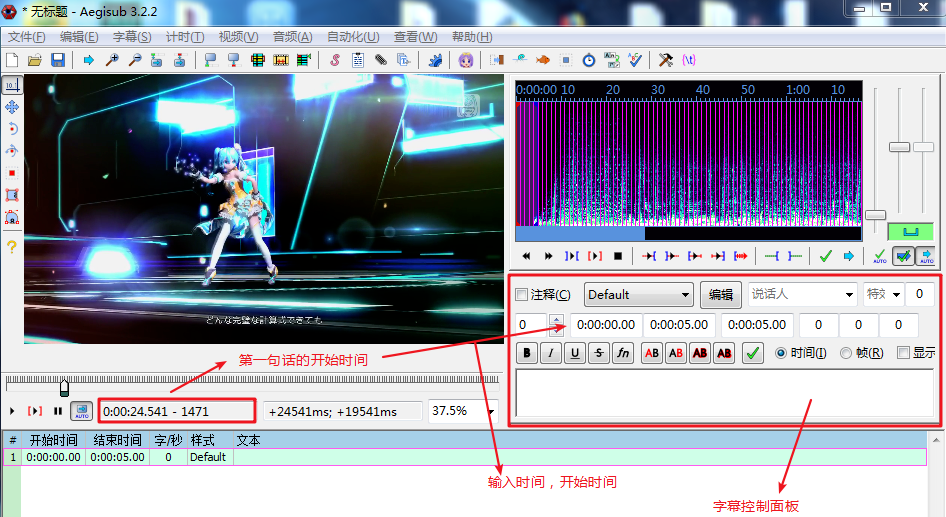 aegisub支持的精度为1ms,普通的视屏播放器支持进度为10ms,找到右边的字幕时间控制面板,输入刚刚记录的时间,24.54,然后再用同样的方式,进行播放,直到初音唱完这句话,然后暂停,记录结束时间,然后输入,下面的空白的地方输入字幕的,时间确定好后,点击旁边的那个绿色的小勾,字幕就出现在视屏上了