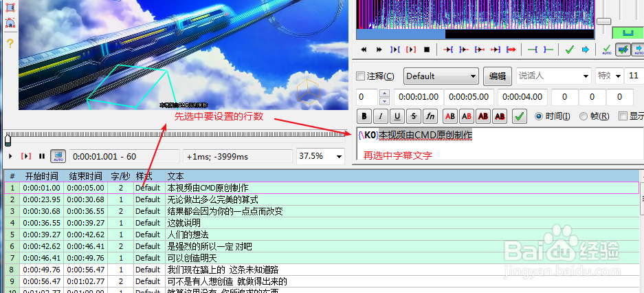 设置字幕的样式,按照上面的方法,弄好字幕后,设置一下样式,aegisub的快捷键和window或者word的一样,先在字幕面板选择,要设置样式的字幕行,在时间控制面板,随意选中字幕文字,必须要选,不然会出问题