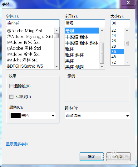 然后点击下面的fn按钮,设置字体,建议使用simhei的字体,文字比较规范,工整,后期用TCAX弄特效的时候不会出错,当然看个人选择,如果视屏最后要使用手机看的话字体建议设置大小在29-32之间,