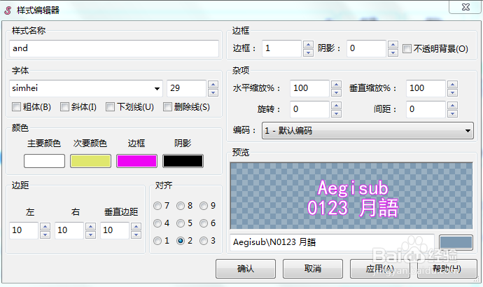 点击新建,弹出样式设置窗口,大家可以自行设置,样式的名称,颜色这些,边框和阴影默认是2,通常建议边框设置为1,阴影为0,除非特效需要,对齐的话2是底端居中对齐,其它的大家可以编辑好后,直接应用一下,就可以在视屏上查看效果,边距的话不需要解释,和word的一样,设置好后点击确定。