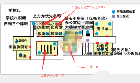 如图所示,出生点就在二楼,直接穿过办公室,去教室01和02找人,99%有人。