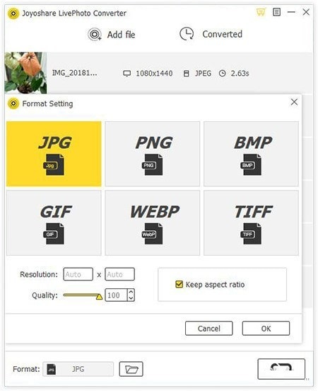 之后,您有权使用“播放”按钮播放实时照片,或者在指定文件后面使用“编辑”按钮选择所需的帧。确认选择后,继续按“格式”面板选择所需的输出格式,如JPG,GIF,BMP,PNG等。此外,分辨率和质量可以自行调整。或者您可以决定是否保持纵横比。