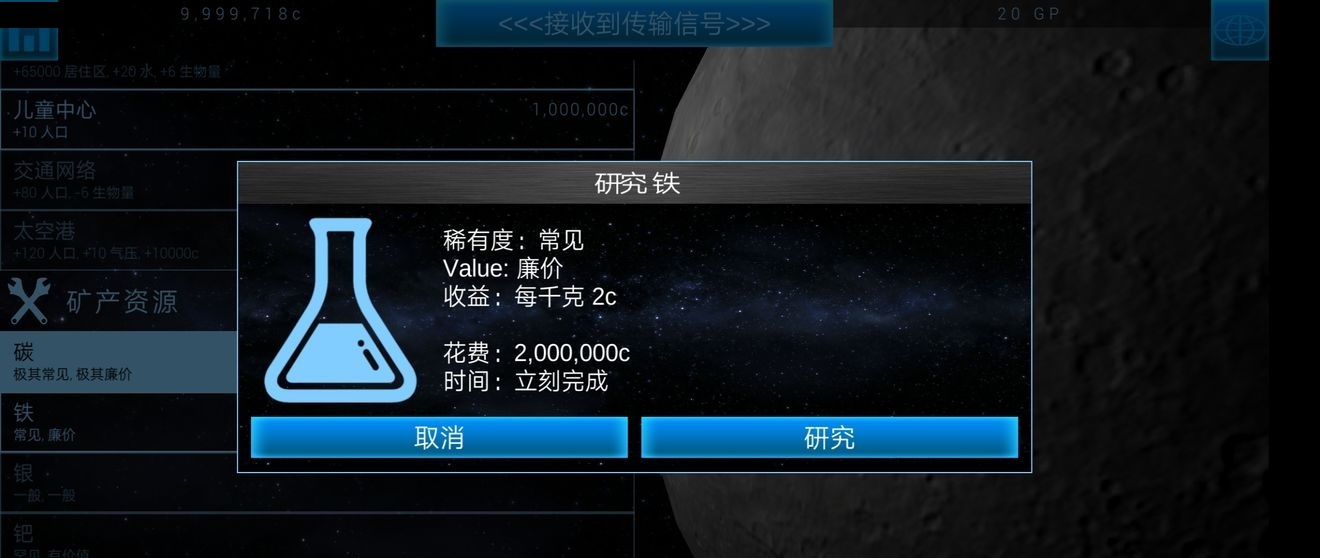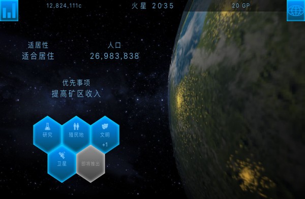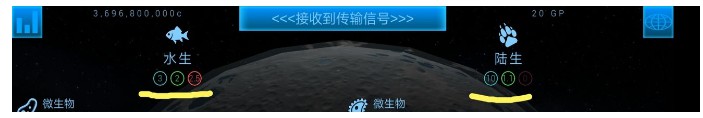 游戏的研发项目分为温度、气压、氧气、液态水、生物、人口和矿业7个主目录,每个下辖6个子项目。绿色代表当前已拥有,蓝色代表当前可研发,灰色代表需要达成一定条件才能开启。初始状态下每次只能研发一个项目,通常需要数十分钟到数小时才能完成(我们也可以通过消费GP点进行加速)。