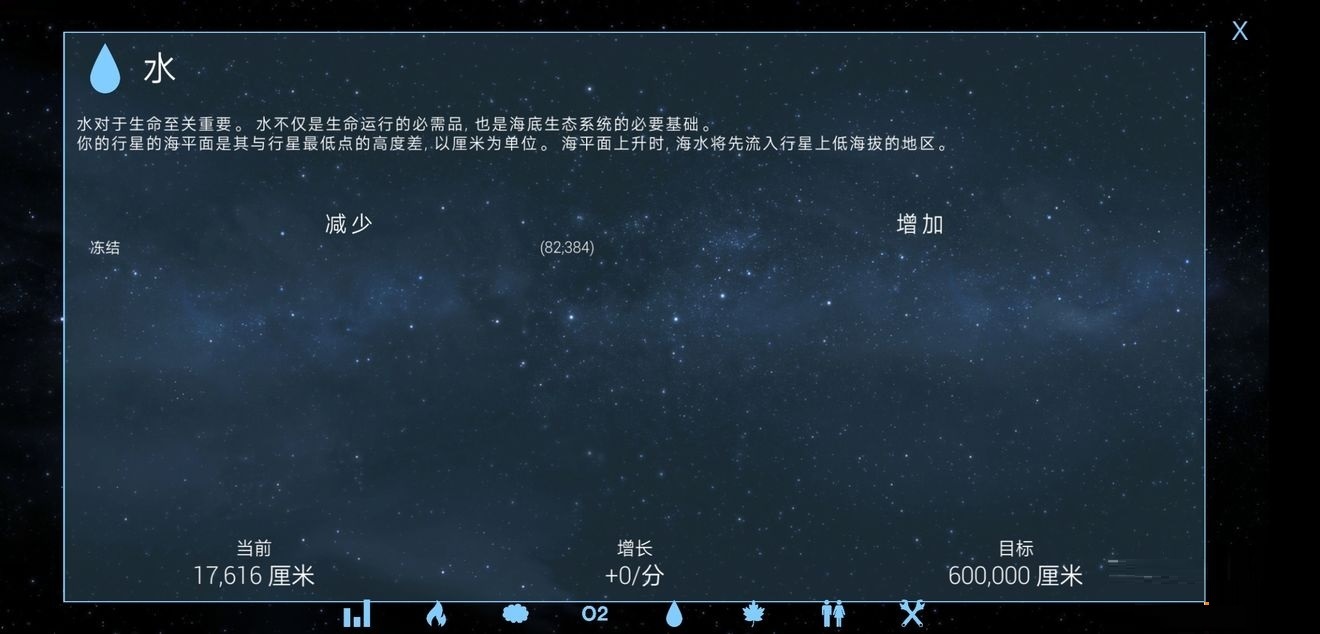 进入游戏后第一个殖民地是免费的,建议放之前先看一下水资源的目标,以火星为例(在没有水的情况下)目标是600000厘米,换算过来就是6千米,殖民地放到海拔7,8千米就算是沿海了(别问我为什么要沿海,看着舒服)