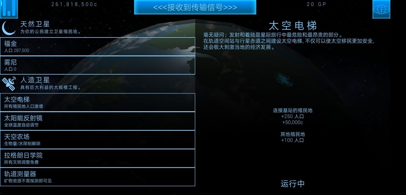 太空电梯,造价一亿(100,000,000),建造时间1d12h,对连接基站的殖民地+250人口增长+50,000c,对其他殖民地+100人口增长。个人认为这个东西没什么卵用,加成不如一个太空港,就是个吉祥物,如果不是喜欢收集东西的玩家就不要造了