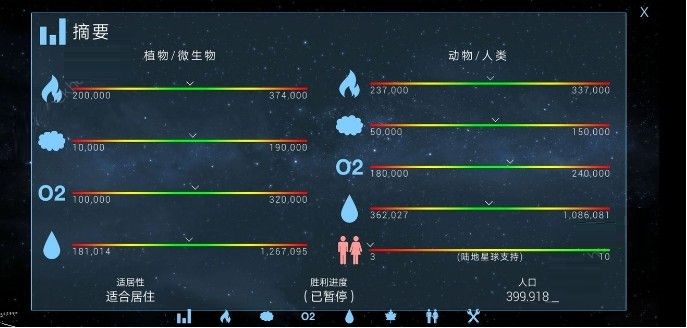 生态调整,顺序是气压→温度(气压影响温度)和氧气→水(温度影响水)和生物,我建议先直接用第三级的建筑进行调整(速度快而且有其他收益),然后用一二级的微调。