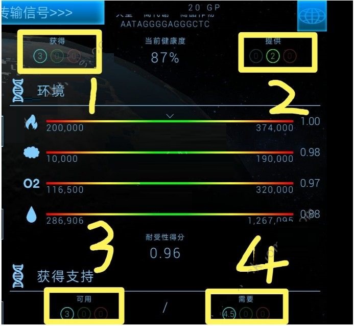在游戏中每种生物都会消耗生物圈中一定数量种类的“支持”(微生物不消耗支持),也会为生物圈提供一定数量种类的“支持”。