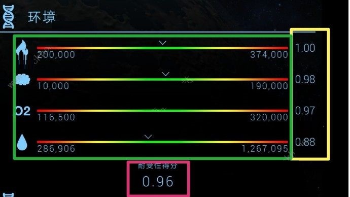 黄色方框为当前环境与最佳环境的偏差值(过高或过低都会产生偏差,最高为1,最低为0,越接近1越好)