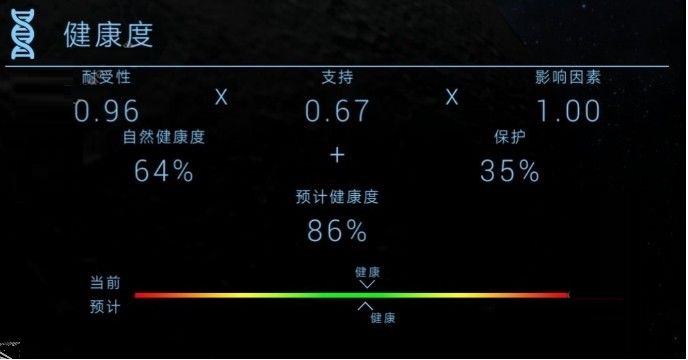 健康度是反映物种在自然界中生存状况的最终因素,最佳值为100%,100%±33%为健康。67%~33%为近危,32%~1%为濒危,0%为灭绝,134%~167%为过多168%~200%为过剩。某一物种灭绝或过剩都会对其他物种产生影响(狼多羊少,羊灭狼灭)。
