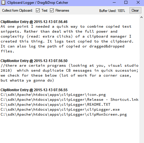 该程序不需要安装本身,而是你可以打开它在任何需要的位置在您的本地驱动器。接口包括一个单一的,可调整大小的窗口是简约朴素,但适当的功利作用。你应该知道,这个软件背后的想法是让你捕捉任何你复制粘贴,你可以在以后使用它。考虑到工具可以抓取的数据量相当令人印象深刻,你可以找一点信息的特定部分,你应该记住,你可以添加一个时间戳的条目。