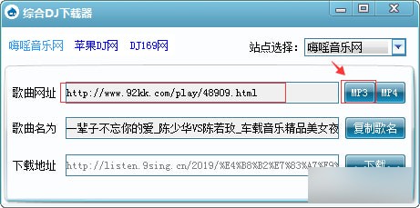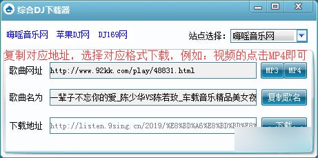 综合DJ下载器又叫多站DJ音乐下载器,支持非常方便的DJ音乐下载分析功能,通过复制音乐链接地址可以直接下载,目前支持三个网站嗨摇,Apple DJ和DJ169,暂不支持清风音乐网,后续会加上!【综合DJ下载器绿色版使用方法】