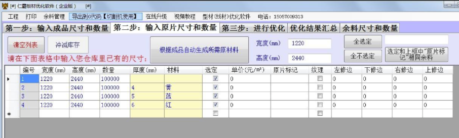 3、可以同时选用多种不同的原片规格优化,例如 2400x1900、2200x1500、2200x1600等,并且系统要求输入原片的数量,在优化过程中,如果该原片的数量使用完,系统就不会再用该原片进行优化。