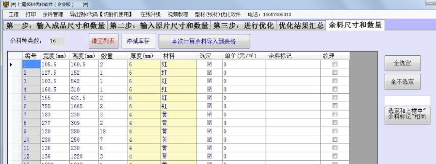 4、排版完成后可以自动算出可重新利用的余料,并且可以导入到余料库存,以备下次优化可以将余料加入计算。