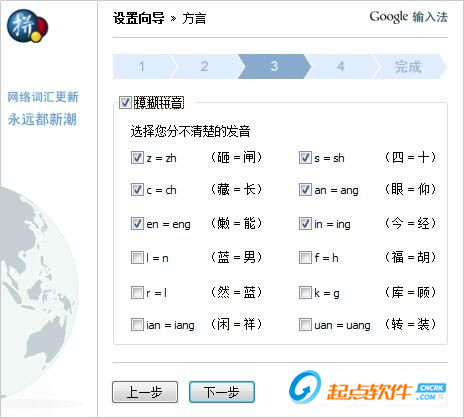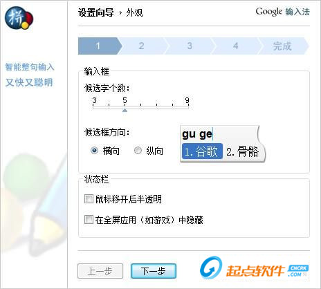 谷歌拼音输入法的设置向导第一步需要我们设置谷歌拼音输入法的外观,我们可以选择谷歌拼音输入框中的候选字个数和候选框方向。还可以设置谷歌拼音状态栏在鼠标移开后半透明显示和在全屏软件(如游戏)中隐藏。根据自己的实用习惯勾选即可;点击[下一步]继续设置;