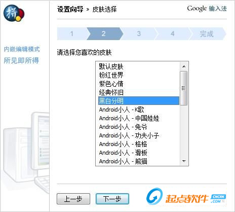 第二步需要我们选择谷歌拼音输入法的皮肤,在选择皮肤的同时还可以预览皮肤效果。谷歌拼音提供了大量的输入法皮肤供各位使用,有认皮肤、粉红世界、紫色心情、经典怀旧、黑白分明可以选择。选择好之后点击[下一步]继续设置;