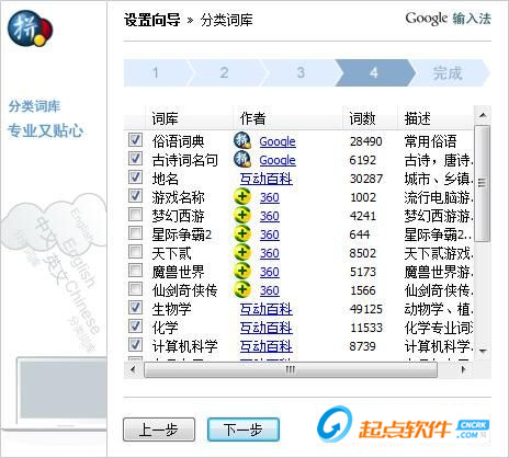 第四步是词库选择,谷歌拼音输入法提供了很多词库,分类词库,专业又贴心,从日常生活到专有名词。我们可以选择俗语词典、古诗词名句、地名、游戏名称、生物学、化学、计算机科学等分类词库,使我们的输入更加方便。点击[下一步]继续设置;
