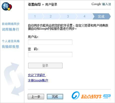 最后一步是登陆谷歌账号,使用谷歌账号进行用户词库同步和输入习惯同步,是非常方便实用的功能。输入账号密码后点击[登陆]就可以了。设置完成后,我们点击[完成]就可以完成谷歌拼音输入法的设置向导,开始实用谷歌输入法了。