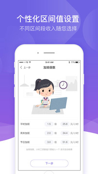 1.加班统计:您可以看到月总加班天数,总加班时间,总加班工资。记加班记账是您永不丢失的加班时间记账本。