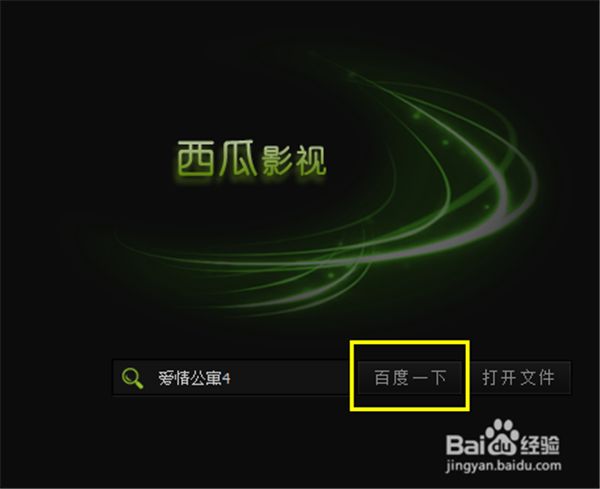 1、在“西瓜影音播放器”界面中,可以直接利用百度来搜索“西瓜影音播放器”所支持的视频。如图,在搜索框中输入要搜索的视频,点击“百度一下”按钮。