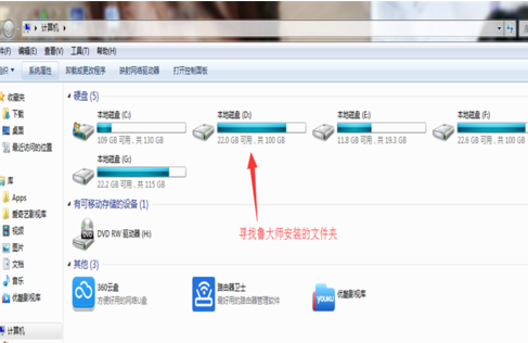 2.进入计算机里面后,找到安装的盘后,进入找到你选择安装的文件夹,小编是直接以鲁大师命名的,如图。