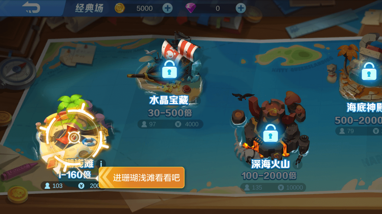 正所谓“千里之行始于足下”。新手玩家进入经典场后,第一步是在最简单友好的珊瑚浅滩学习捕鱼。同样,点击光圈进入吧。