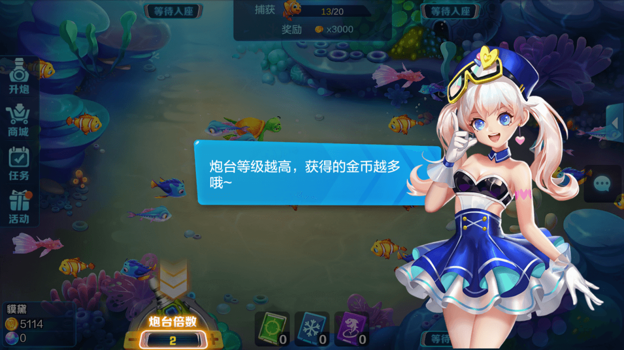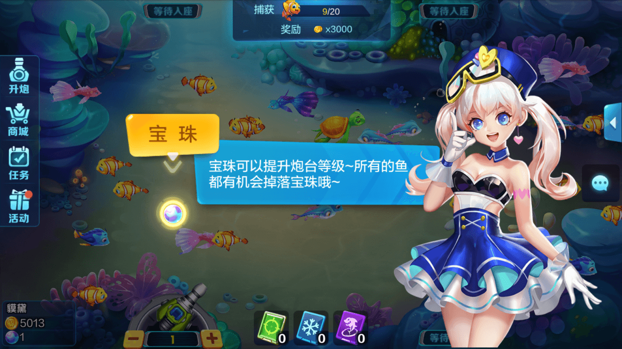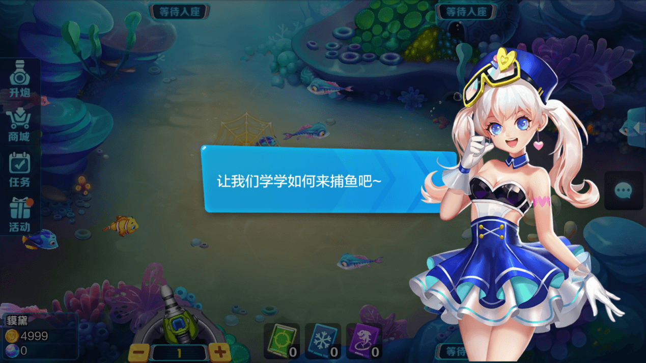 第一个新手任务就此开始,大家需要用一倍炮尝试捕获20条小丑鱼。小丑鱼的形象已经在水手姐姐的对话框中有提示。
