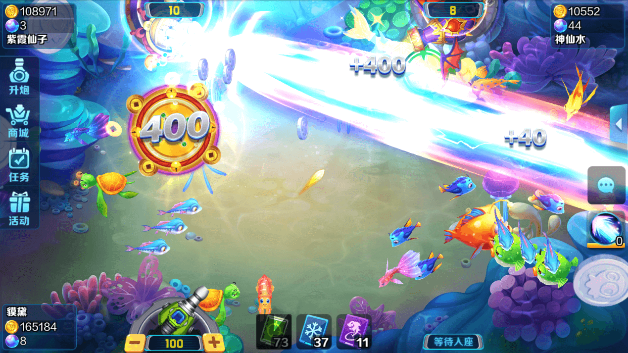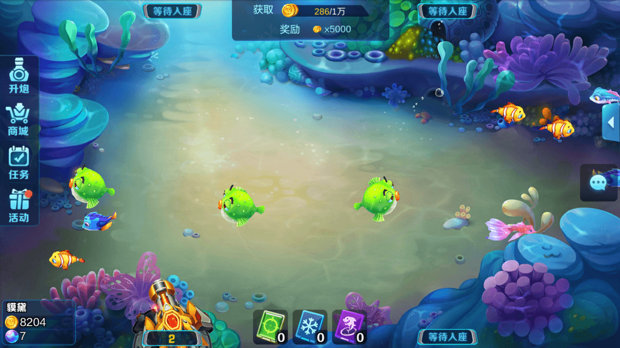 每个捕鱼房间都有4个座位,玩家本人的席位总是在下方的两个座位之一,屏幕上湛蓝的海洋中,游弋着的鱼儿们就是大家需要捕获的目标了。