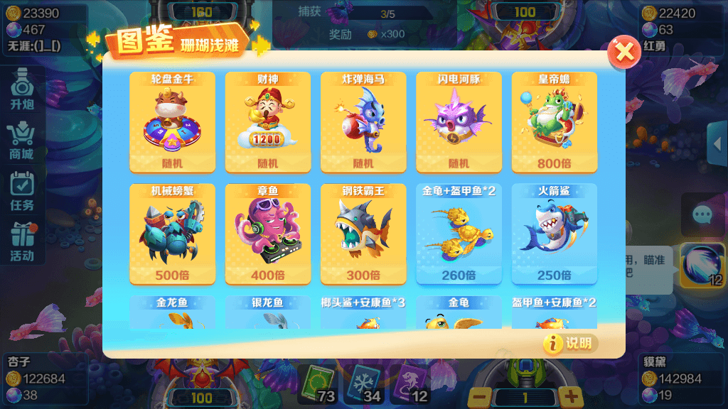 查看右侧拓展栏的图鉴,大家便可知道,珊瑚浅滩中的鱼类有很多种,对应的倍数越高,捕获的难度也就越高。激萌的财神、圆滚滚的闪电河豚、憨态可掬的轮盘金牛、还有DJ章鱼等,都会带来丰厚的奖励,见到它们时,可不要轻易的让它逃跑哟!