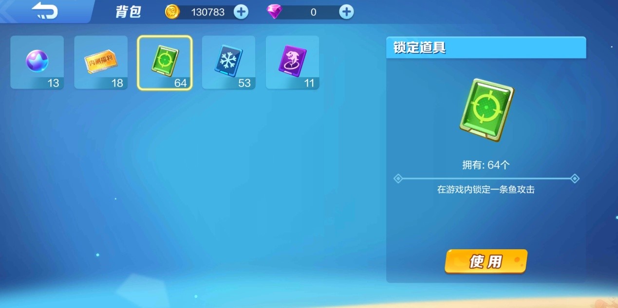 道具·锁定:锁定道具可通过幸运抽奖、完成任务、参与活动、商店购买等方式得到。点击使用后,会出现一个绿色带箭头的锁定圈在鱼身上,玩家可以通过更换目标以锁定其他对象。这时,无论这只鱼距离多远,都能在解放双手的前提下对其开炮。一方面,当某只鱼在锁定时间结束前被捕获,锁定会自动切换其他目标;另一方面,锁定的CD与其效果存在时间同步,如对应的鱼捕获尚未完成,可继续点击锁定攻击。