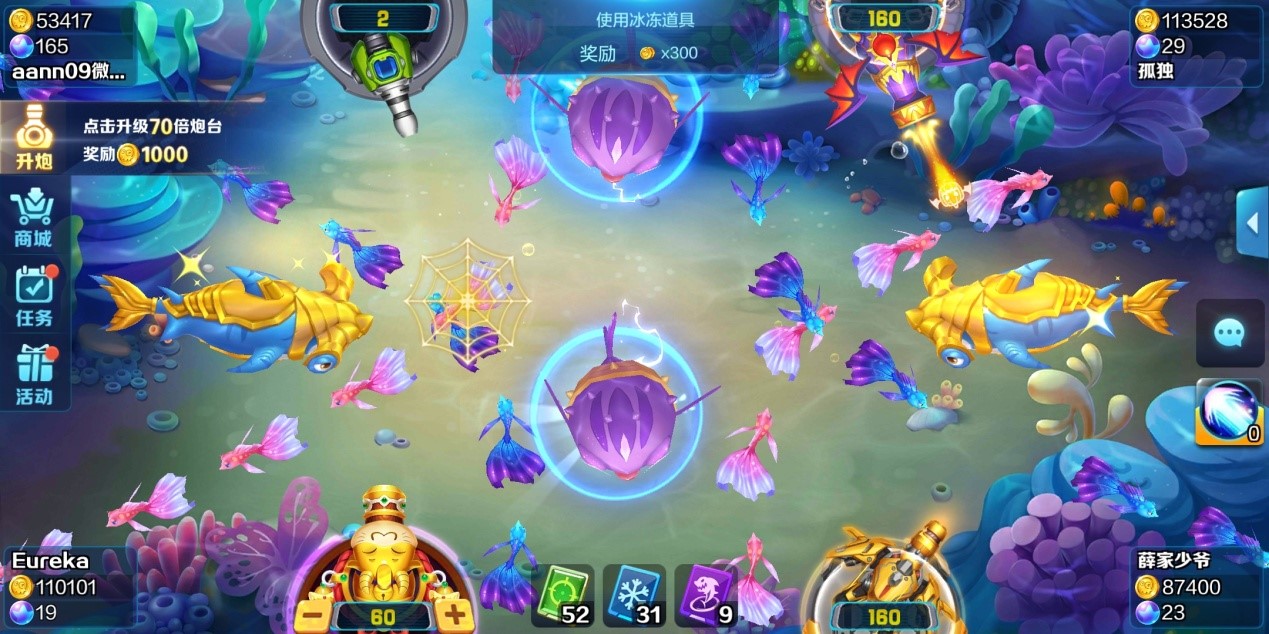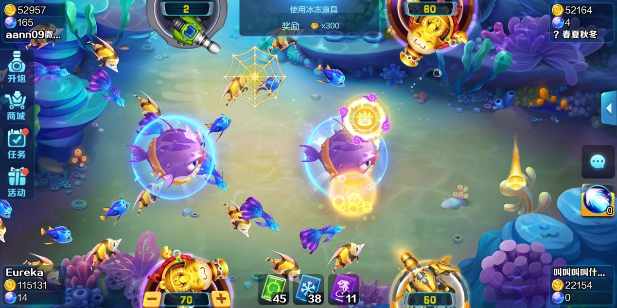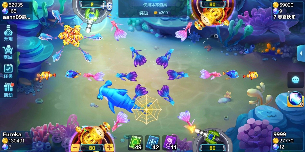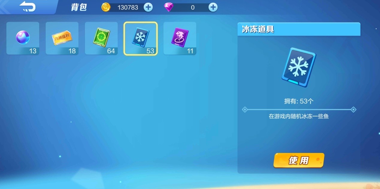 道具·冰冻:使用冰冻后,屏幕上的鱼群会随机被冻结,这时捕获的难度大大降低,大家一定要好好使用,尽量在BOSS存在或鱼潮来临时使用冰冻道具哦。