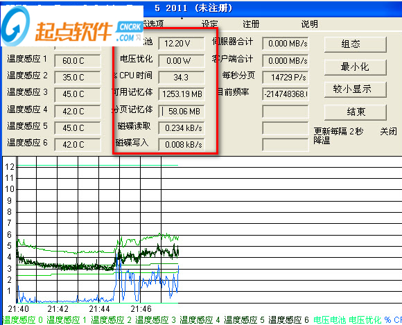 2、监控显示区,您可以在这里查看电压电池、电压优化、可用记忆体、分页记忆体、磁碟读取、写入