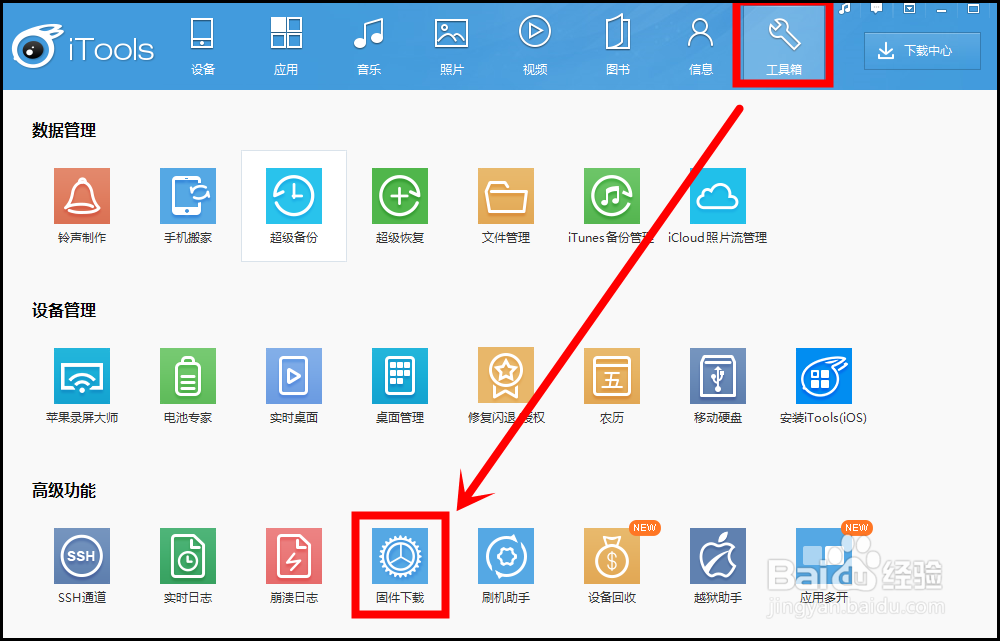 首先,我们让手机与电脑连接,打开ITOOLS,打开后点击工具菜单下的“固件下载”。