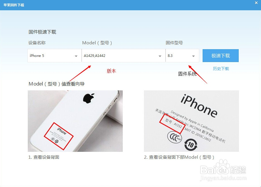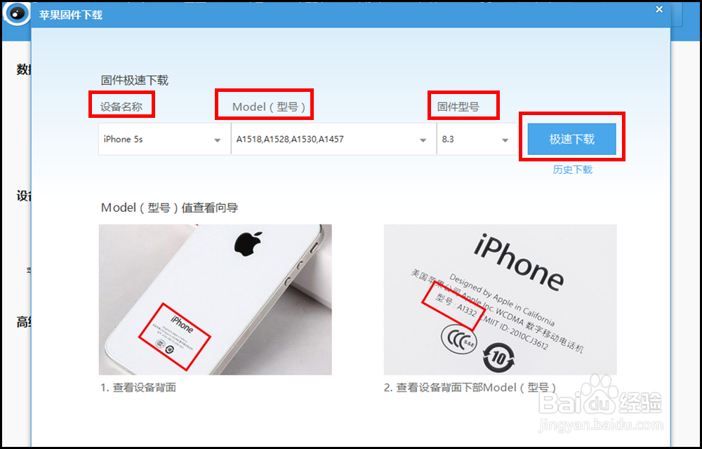 进入“固件下载”后,选择与手机相对应的固件进行下载,这里要看你的手机是iPhone几,还有你的手机型号是什么(看手机背面),选择好后,我们进行“极速下载”。