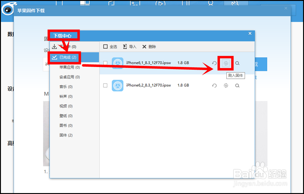 资料备份、固件都下好后,我们就可以进行刷机啦。我们进入固件的下载中心(或者你把固件下载窗口都关掉,点击菜单工具栏下的“刷机助手”),点击相对应固件的“刷入固件”图标。