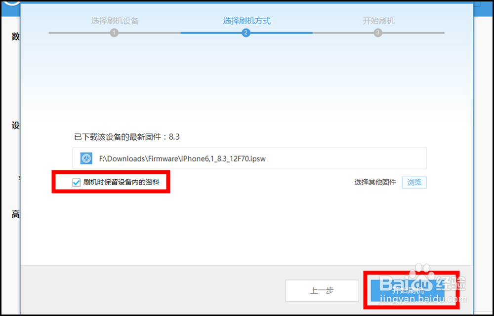 然后我们进入“选择刷机方式”,这里“刷机时保留设备内资料”功能的勾选看你们自己的情况,勾选后,我们点击“开始刷机”。