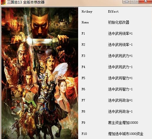 快捷键F11:选中的城市资金-1000(大地图中选择任意一个城市,之后修改,需要先初始化修改器)